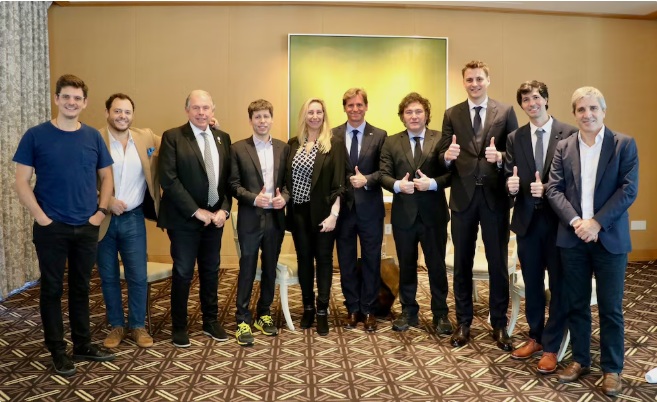 No es la única imagen de aquella jornada, hay otra foto grupal, donde la comitiva completa que acompañó al presidente se luce junto al equipo de OpenAI y su CEO y fundador. Está el “ineficiente” ministro de Economía del macrismo devenido en “gladiador”, Luis Caputo; la secretaria General de la Presidencia, Karina Milei; y el entonces embajador en Estados Unidos (actual canciller) Gerardo Werthein. La escena se completa con referentes de la empresa WorldCoin, su CEO, Alex Blania; el gerente para Latinoamérica, Martín Mazza, y Trevor Traina, jefe de asuntos globales.